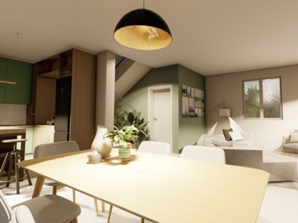 -il PIANO TERRA ospita la zona giorno con cucina a vista e affaccio diretto verso il giardino privato dal lato est. Troviamo inoltre un disimpegno che conduce ad un bagno e un ripostiglio/dispensa.